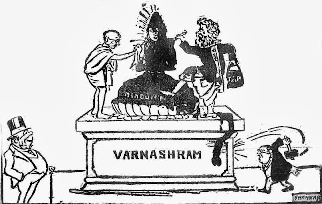 (सनातनी हिंदु धर्माला डांबर फासत आहेत . गांधीजी ते कष्टाने पुसू पाहत आहेत आणि आंबेडकर त्याचा पाया असलेल्या वर्ण व्यवस्थेवर हातोड्याने घाव घालत आहेत. ब्रिटीश लांबून मजा बघत आहेत- तत्कालीन व्यंगचित्र )