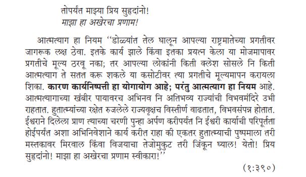 (अर्थ : आकाशातून पडणारे पाणि ज्याप्रमाणे शेवटी सागरालाच मिळते , त्याप्रमाणे कोणत्याही देवाला केलेला नमस्कार शेवटी एकाच ठिकाणी पोचतो: सर्व धर्म समभाव )