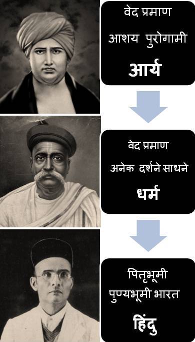 टिळक स्वत:चे लोकमान्यतव कायम ठेवू इच्छित होते . त्यांनी दयानंदाप्रमाणे क्रांतिकारी सामजिक भूमिका घेतल्या नाहीत . पण भारतीय राष्ट्रवाद दक्षिणेतहि रुजावा म्हणून स्वामिजिंचे वेदप्रामाण्य कायम ठेवत , आर्य शब्द टाळून. पुन्हा काफ़िरांचि व्याख्या केली . लोकमान्य टिळकांनी केलेली हिंदूची धार्मिक व्याख्या अशी आहे : -