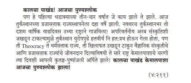 " तो युरोप प्रत्यही अधिक काही शिकून अधिक शहाणा होत आहे . बापाहून शहाणा निघालोच कि नाही ? म्हणुन हुन्कारत आहे . बापाला जे कळत नव्हते ते शिकलो । तर बापाचे बापपण काय उरले? ... हि आमची भीती !