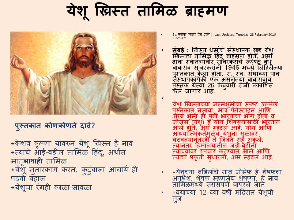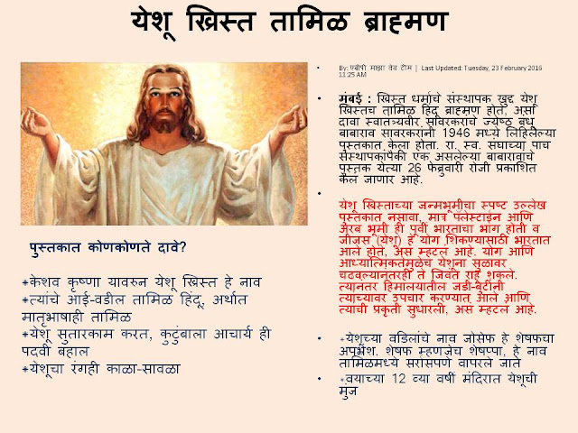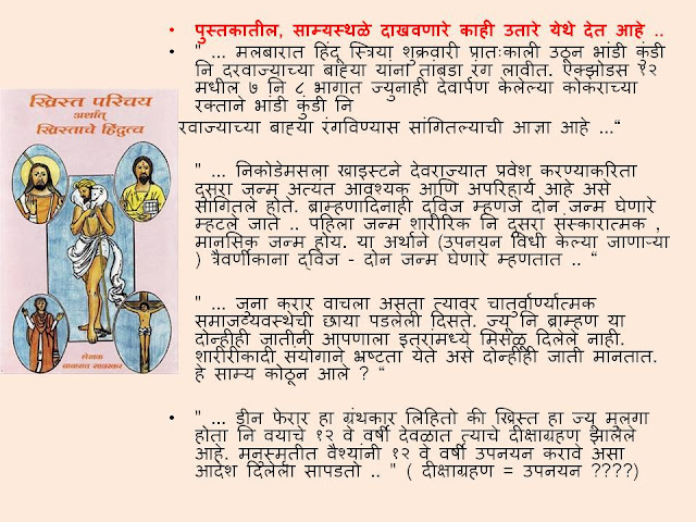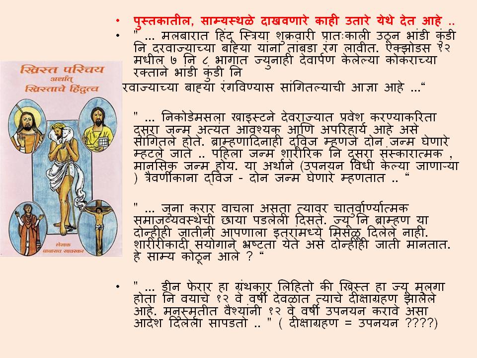 १) ख्रिस्त हा देशी भारतीय ठरतो. त्यामुळे ख्रिस्ती धर्म हा पण भारतीय ठरतो. हा देश पितृभूमी आणि पुण्यभूमी " असलेले" लोक म्हणजे हिंदु अशी वि दा सावरकरांची हिंदुत्वाची व्याख्या आहे. त्यानुसार भारतातील ख्रिश्चन हे हिंदु ठरतात काय ?