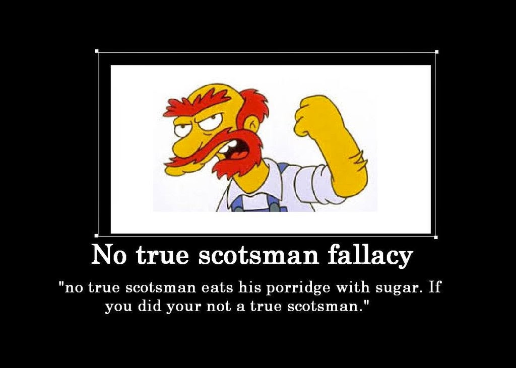 अशा प्रकारे विचार करण्याला तर्कदोष - फेलसि असे म्हणतात. इथे आपले स्कोटीश जातभाई वाईट कृत्य करूच शकत नाहीत असे गृहीत धरलेले आहे. पण नवा अनुभव आल्यानंतर जुने निष्कर्ष बदलले पाहिजेत . पण तसे न करता … स्कोटीश असण्याची व्याख्याच बदलून टाकली आहे . स्कोटीश च्या आधी "खरा" हा शब्द जोडून …. आपल्या निष्कर्षात बसतील तेव्हढेच स्कोटीश " खरे " म्हणायचे असतात ! हा तर्कदोष "खरा" हिंदू दहशतवादी नसतो किंवा "खरा" मुसलमान शांतता प्रिय असतो असाही वापरता येईल . इथे जो शांतात प्रिय नसेल त्याला "खोटा" म्हटले कि आपला तर्कदुष्ट युक्तीवाद पूर्ण होतो.