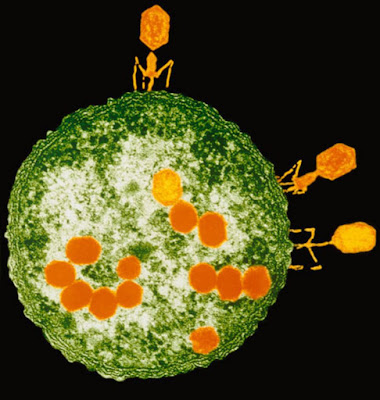 हिरव्या रंगाची ब्याक्टेरिया पेशी आणि त्यावर बाहेरून हल्ला करणारे पिवळे व्हायरस |